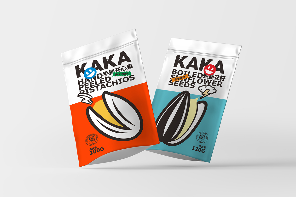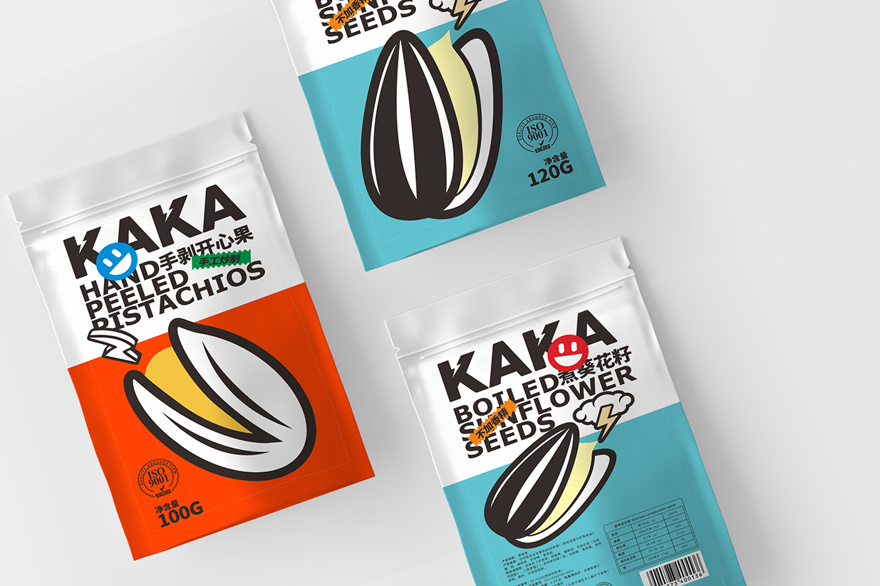 Item Kaka堅果包裝設計 content:包裝設計 Introduction:在Kaka堅果包裝設計中,我們運用了波普風格的典型元素,如幾何圖形、夸張的色彩和簡潔的線條,使包裝呈現出年輕、時尚的氣息。黑色英文品名結合表情貼紙,增加包裝的互動性和趣味性傳遞出Kaka品牌年輕、活力、高品質的形象特點。