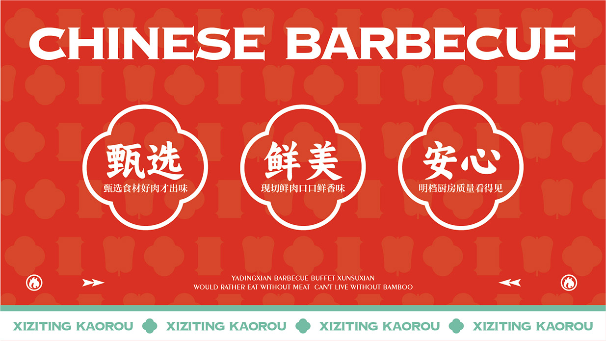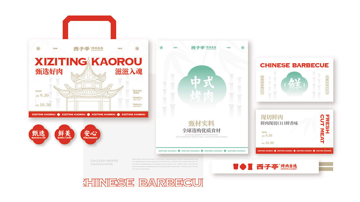 Introduction:西子亭炭火烤肉,秉承傳統炭火烤炙工藝,以老底子老味道為魂,讓美食回歸本真。品牌形象設計采用新中式風格品牌運用炭火紅與竹青,營造出溫馨、舒適的用餐氛圍。同時,借助黑色的點綴,提升品牌的高貴與典雅。